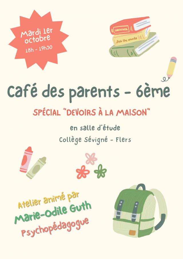 Ce café des parents spécial « devoirs à la maison 6ème » sera animé par Mme Marie-Odile Guth, praticienne en psycho pédagogie positive, qui proposera des outils et des méthodes pour pour permettre aux parents d’aider leur enfant à faire ses devoirs sereinement.